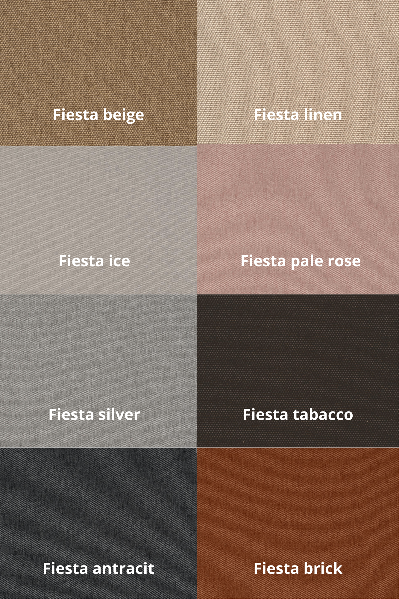 Fiesta BEIGE, Fiesta LINEN, Fiesta ICE, Fiesta PALE ROSE, Fiesta SILVER, Fiesta TABACCO, Fiesta ANTRACIT, Fiesta BRICK, Harrison AMBER, Harrison ANTRACITE, Harrison AUBERGIENE, Harrison BEIGE, Harrison BROWN, Harrison CREAM, Harrison DENIM, Harrison SILVER